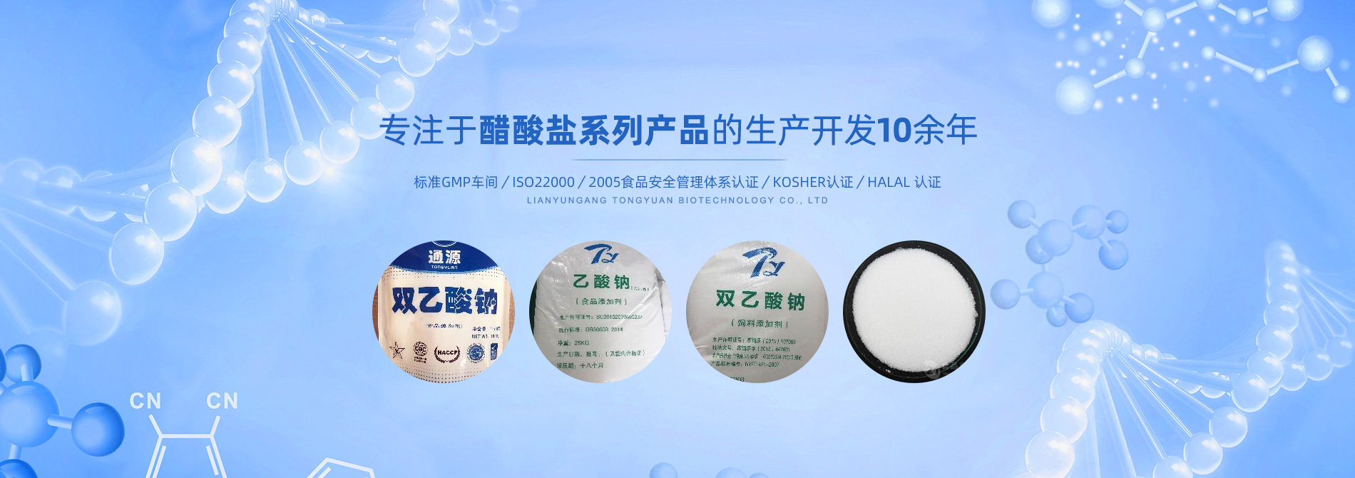 連云港市通源生物科技有限公司 是生產(chǎn)雙乙酸鈉、無水醋酸鈉、三水醋酸鈉、醋酸鉀、乙酸鈉、丙酸鈉、丙酸鈣和氯化鉀等系類醋酸鹽產(chǎn)品的專業(yè)制造商。公司專注于醋酸鹽系列產(chǎn)品的生產(chǎn)開發(fā)10余年,是國內(nèi)專業(yè)醋酸酸鹽產(chǎn)品生產(chǎn)基地。 目前,我們已和全球30多個(gè)國家和地區(qū)建立長期的業(yè)務(wù)合作關(guān)系,是中國較大的雙乙酸鈉生產(chǎn)商和出口商之一。作為中國食品添加劑和配料協(xié)會(huì)理事單位,通源公司已建成標(biāo)準(zhǔn)GMP車間5000余平方米,通過了ISO22000:2005食品安全管理體系認(rèn)證、KOSHER認(rèn)證、HALAL 認(rèn)證等,這些都是我們提供高質(zhì)量產(chǎn)品和優(yōu)良服務(wù)的前提和確保。 生產(chǎn)出色產(chǎn)品,提供優(yōu)良服務(wù),滿足顧客需要,是我們努力的目標(biāo)。愿和我們的朋友們攜手,共...